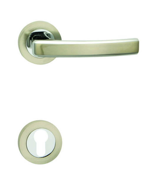 kombinace matného niklu lemovaného lesklým chromem na klice i rozetě.